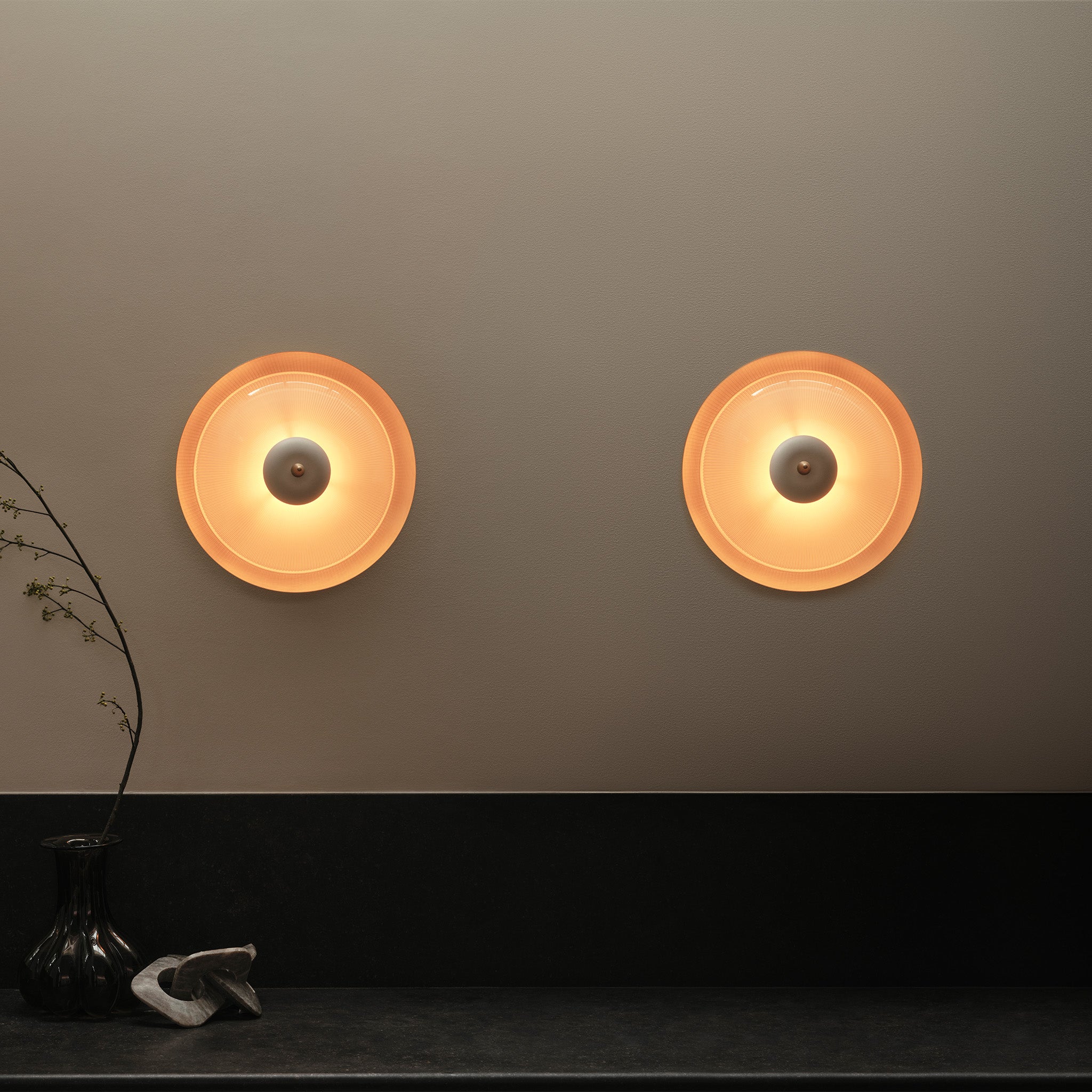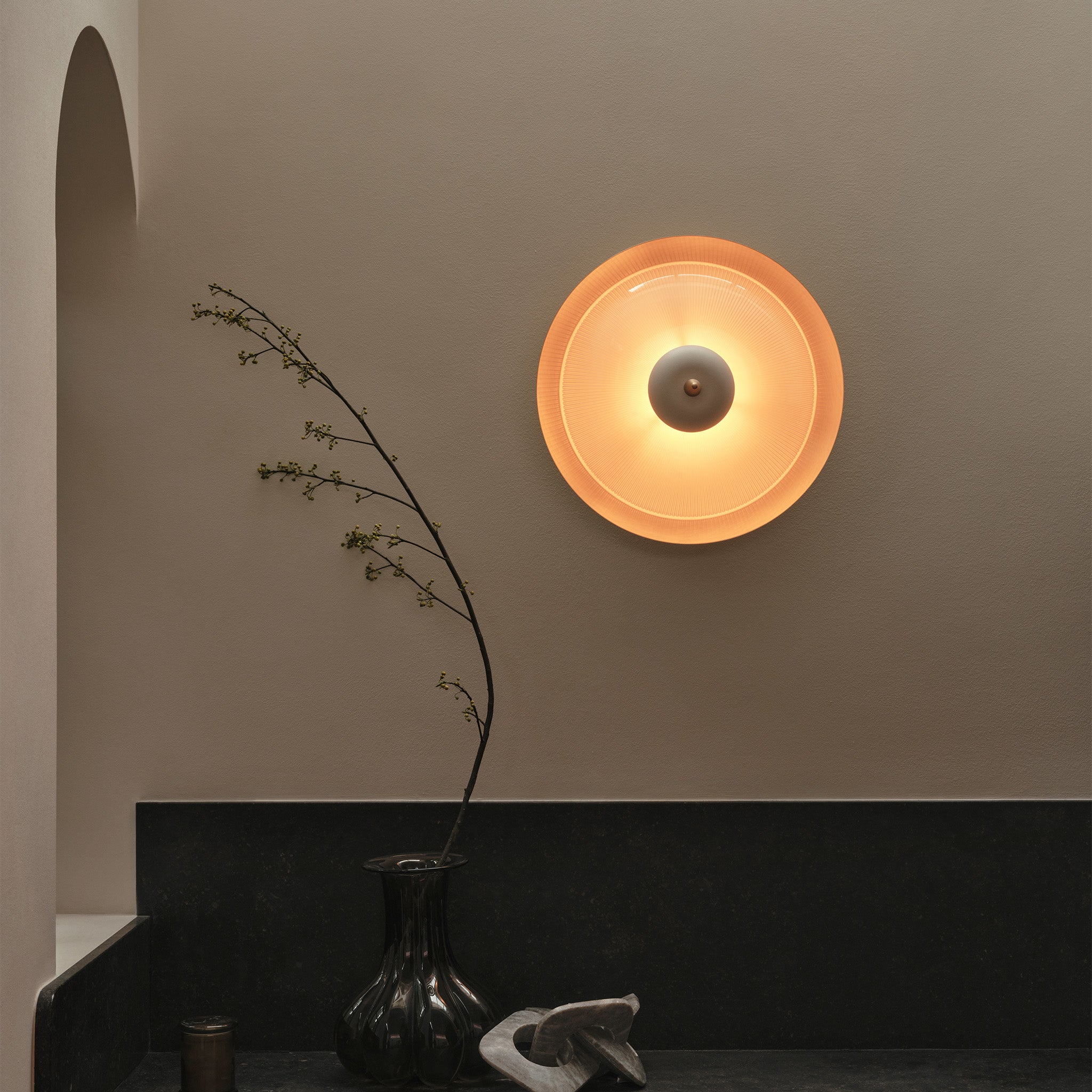 Durant aplik, dokulu cam yüzeyiyle ışığı nazikçe kırarak yumuşak ve prizmati bir aydınlık sağlıyor. IP44 koruması sayesinde banyolarda ve yaşam alanlarında kullanılabiliyor. Farklı pirinç kaplamaları ve on renk seçeneğiyle kolay uyum sağlarken, sade detayları tasarımı zamansız kılıyor.