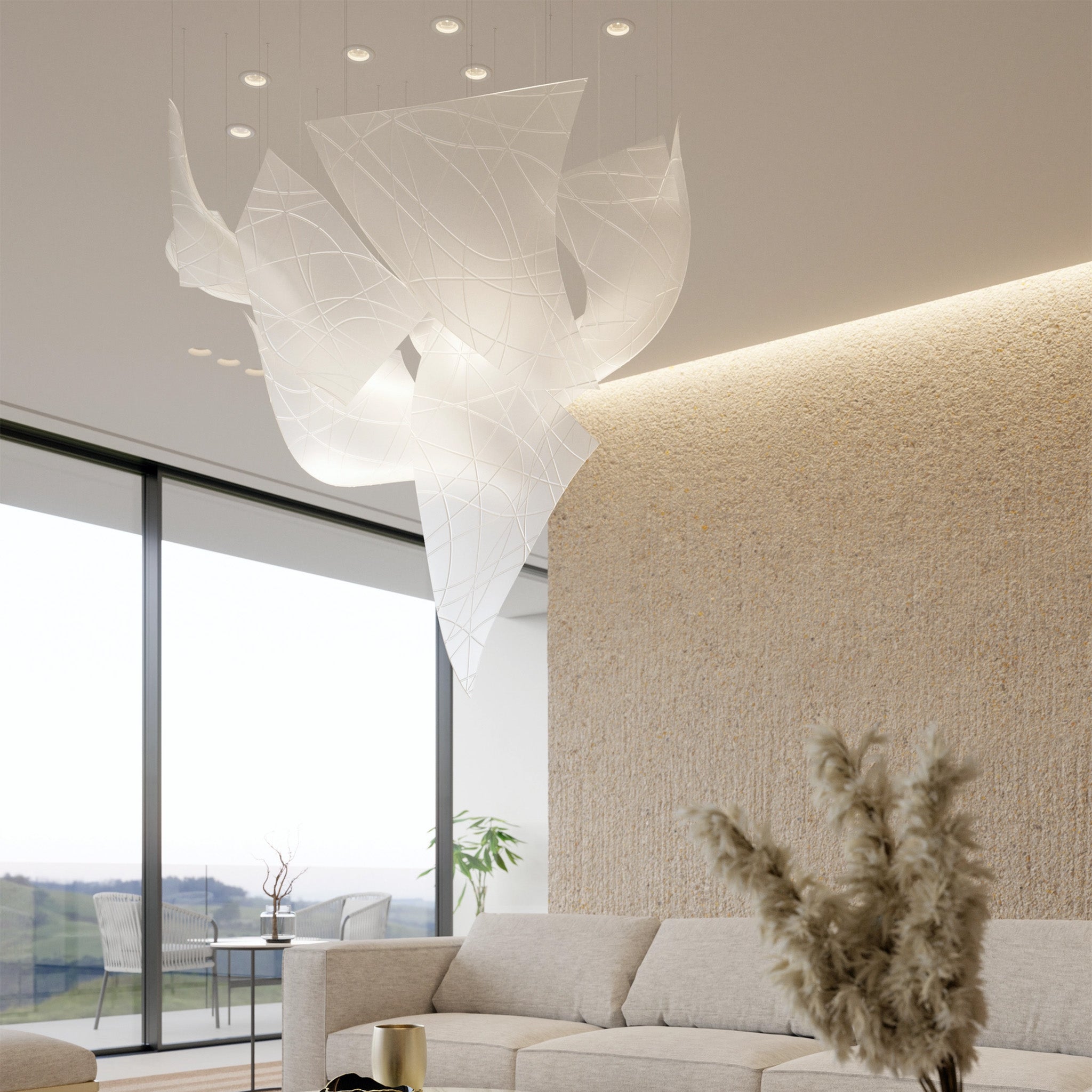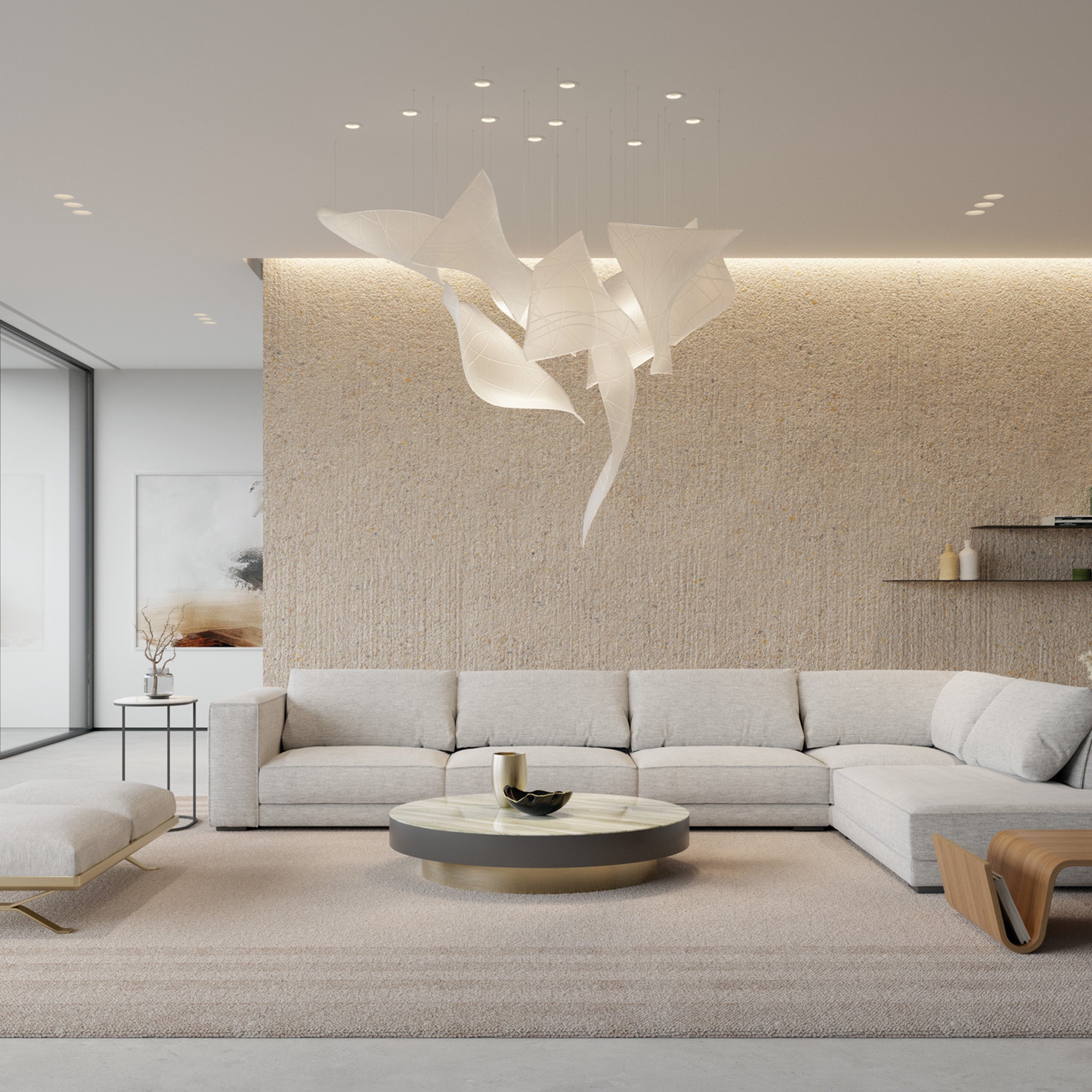 Ivan Valigura’nın tasarımı Flux, dönüşümün kısa ama büyüleyici anını yansıtıyor. Buzun çözülmeye başladığı o geçiş anından ilham alan koleksiyon, farklı açılarda konumlanan keskin kristal parçalarla ışık ve gölgenin dinamik bir oyununu oluşturuyor. Değişimin zarafetini saf haliyle ortaya koyan Flux, mekanlara hareket ve derinlik kazandırıyor.