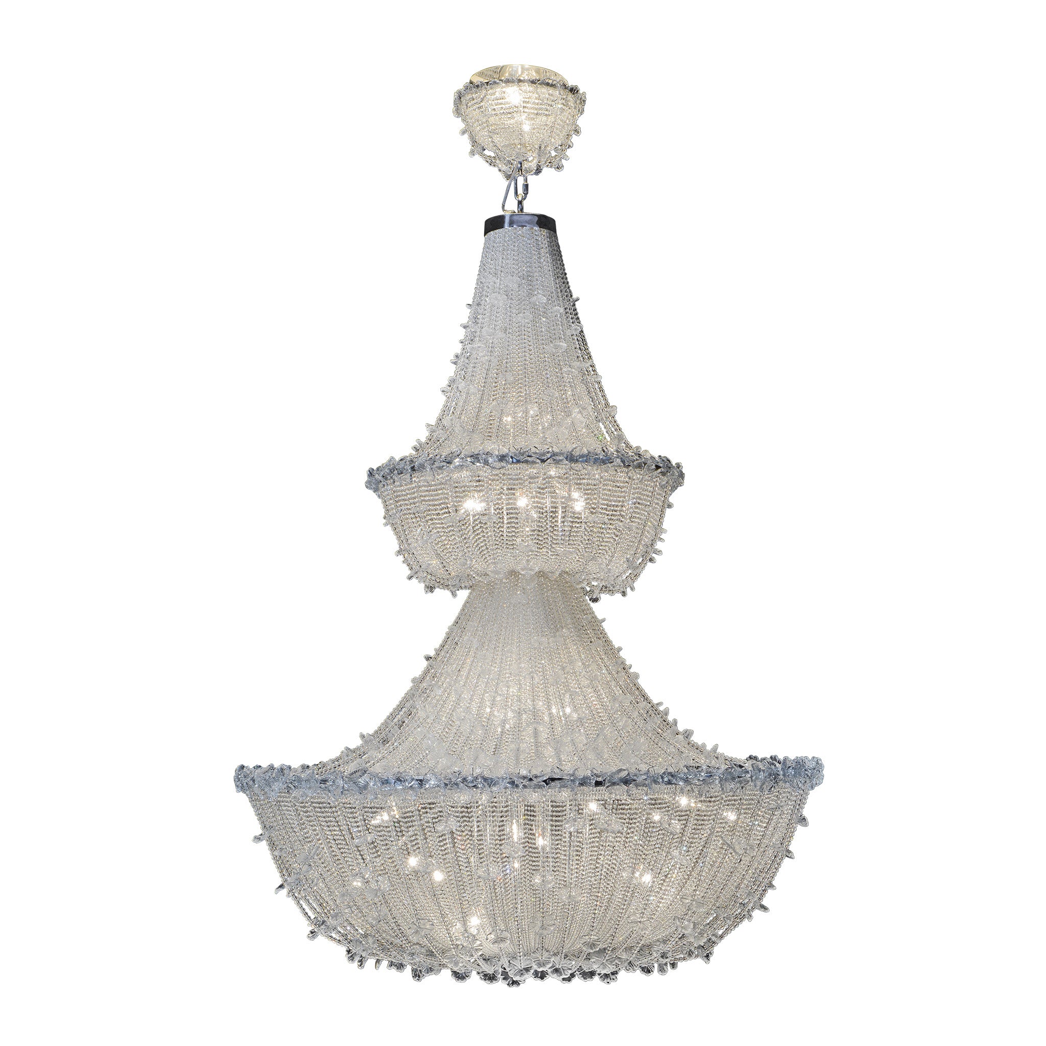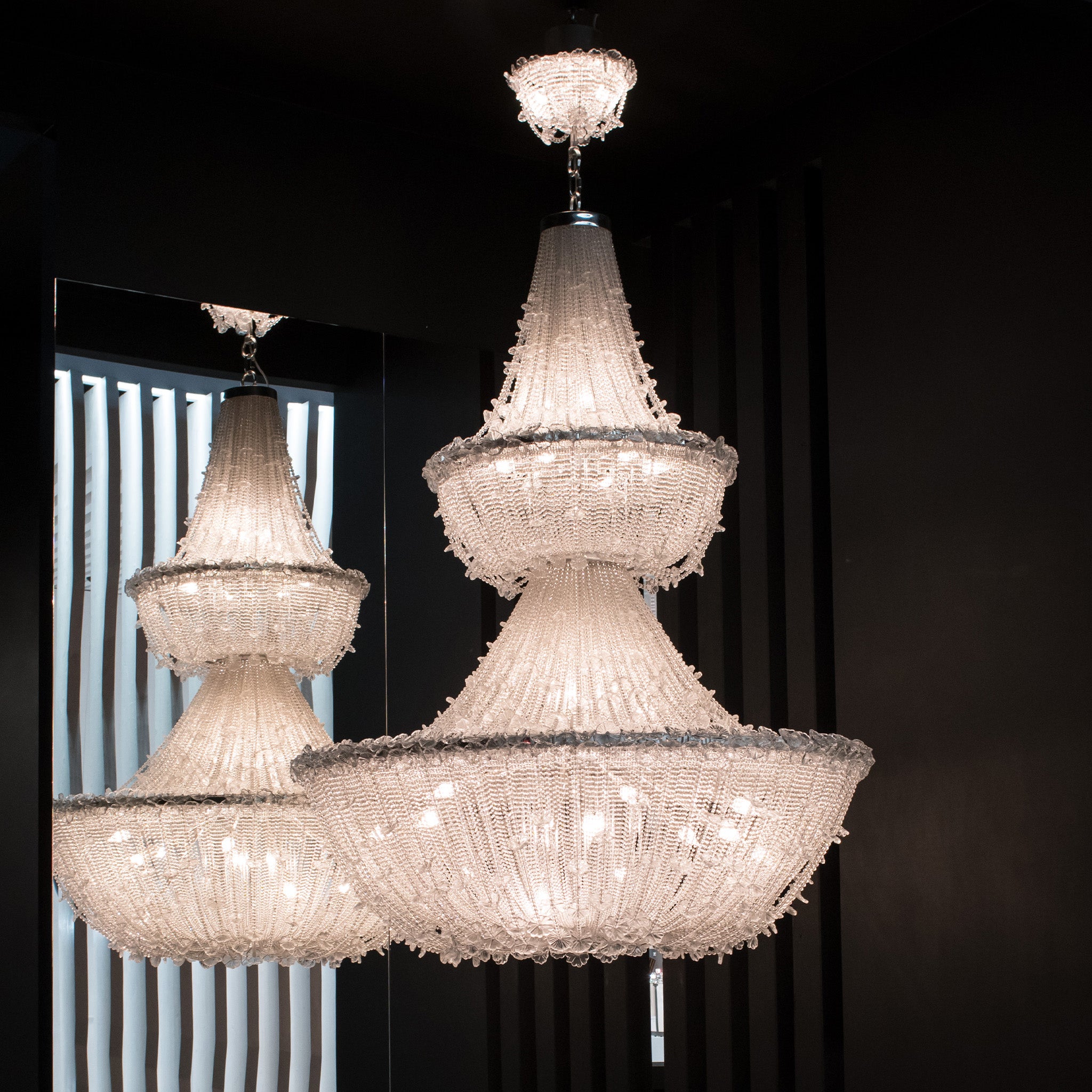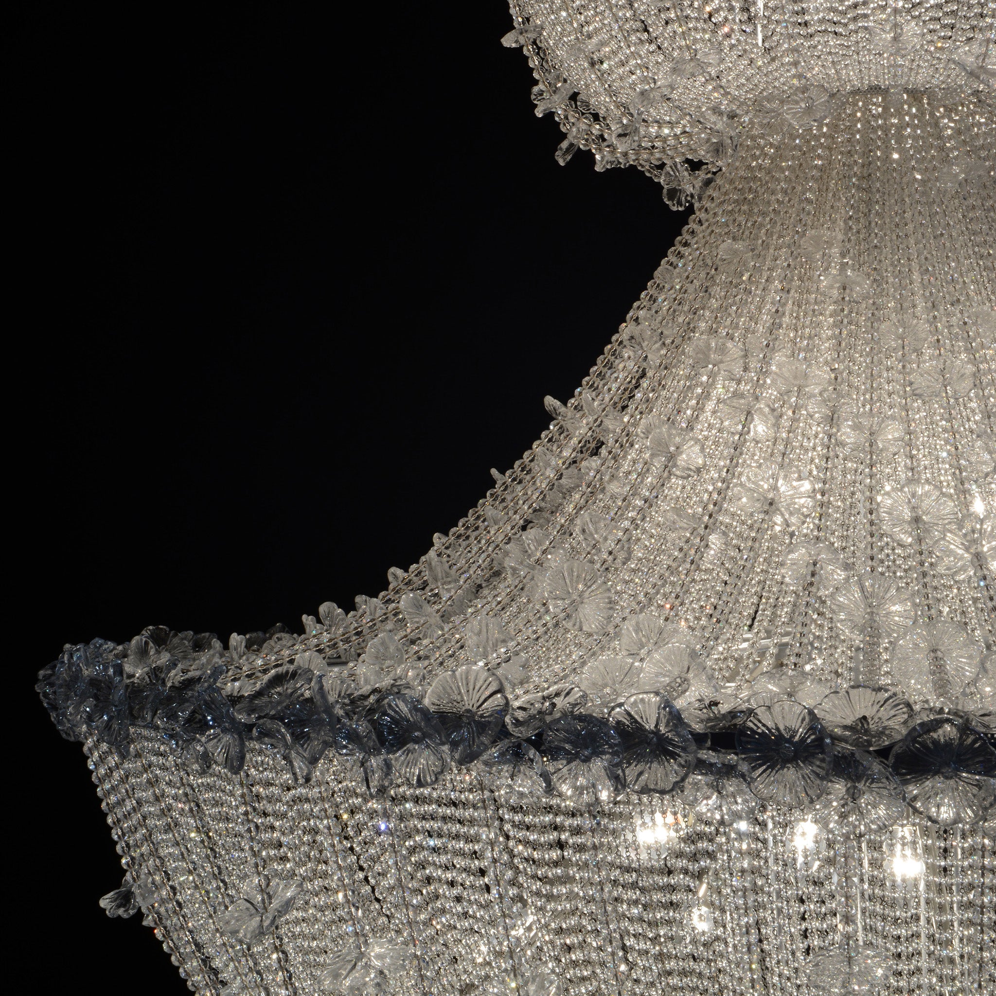 Geleneksel metalik bir yapı üzerine yerleştirilen şeffaf inciler, Murano üfleme camından yapılmış papatyalarla zenginleşiyor. El işçiliğiyle üretilen bu detaylar, tıpkı gerçek çiçekler gibi kendi benzersizliğiyle doğal bir görünüm koruyor.