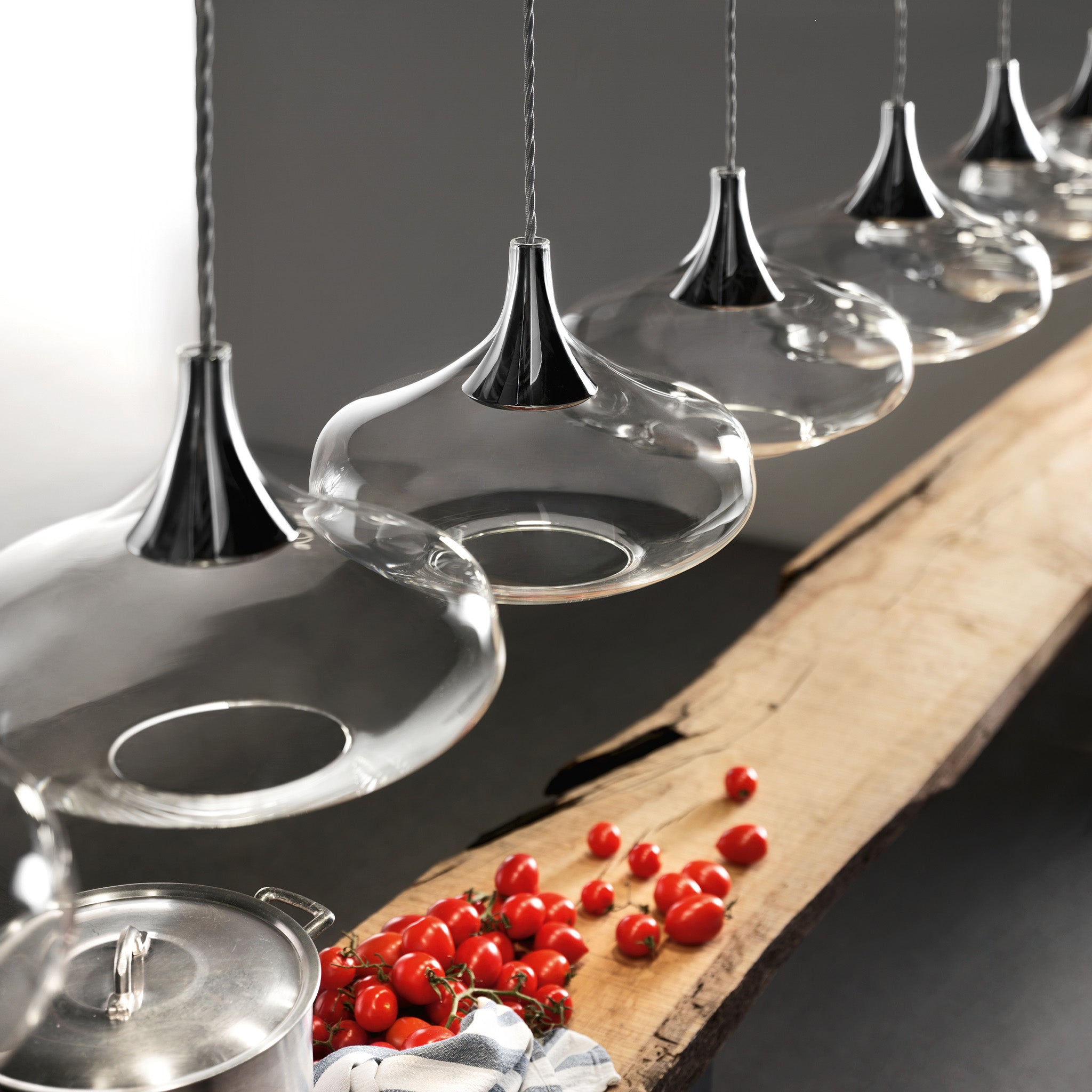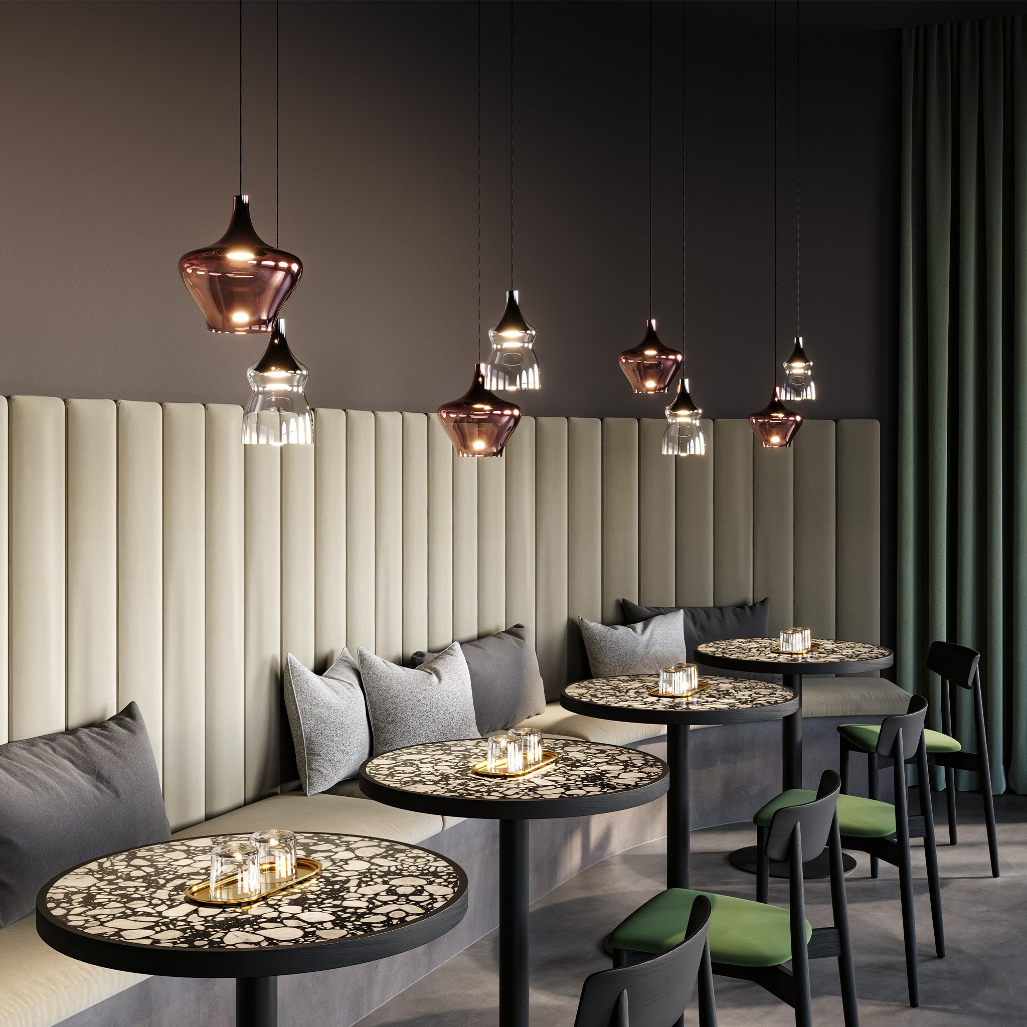 Dima Loginoff tasarımı Nostalgia, üç farklı cam formuyla geçmişe gönderme yaparken modern LED teknolojisiyle günümüz estetiğini bir araya getiriyor. Üfleme camın zarafeti, beş farklı yüzey seçeneğiyle bir araya gelerek ışık açıkken de kapalıyken de etkileyici bir atmosfer oluşturuyor. Farklı yüksekliklerdeki kombinasyonlarla oluşturulan küme uygulamaları, iç mekânlara şık ve teatral bir ifade katıyor.